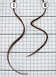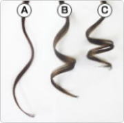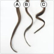●ダメージレベル2~3の毛束に それぞれのセット剤を塗布し、 ホットカーラーを巻き、10分間室温 放置 ●放置後カーラーからはずし、 室温25℃・湿度35%で24時間 放置する。 ●対照として、同じものを室温25℃ ・湿度70%で24時間放置する。 |
